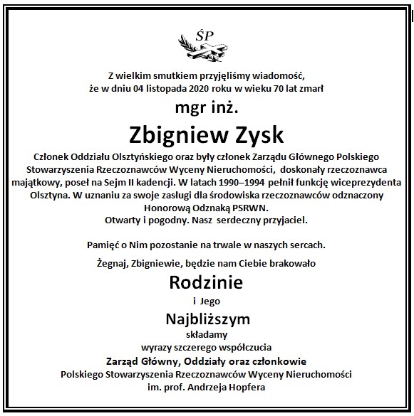 Smutna wiadomość – nie żyje Zbigniew Zysk przez Bartosz Rawa · 6 listopada 2020 Uroczystości pogrzebowe rozpoczną się 10.11.2020 r. (wtorek) o godz. 10.00 mszą świętą w Kościele pw. Chrystusa Króla przy ul. Wyspiańskiego. Ceremonia pochowania odbędzie się na cmentarzu komunalnym przy ul. Poprzecznej w Olsztynie.